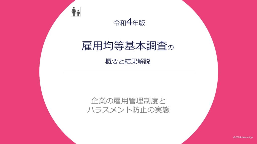 調査概要 令和4年に厚生労働省が実施した「雇用均等基本調査」は、男女の雇用管理の実態を把握し、雇用均等行政の方向性を検討するための一般統計調査です。対象は、常用労働者5人以上を雇用する民間企業のうち、産業・企業規模別に層化して無作為抽出され... -