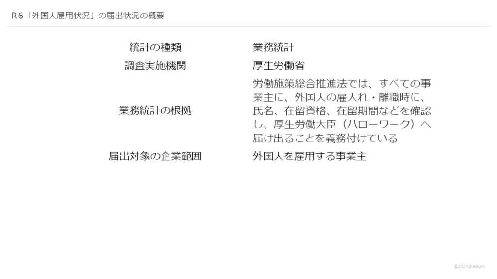 「外国人雇用状況」は厚生労働省が発表する業務統計です。この統計は、労働施策総合推進法に基づき、すべての事業主が外国人労働者の雇入れや離職時に届け出た情報を基に作成されています。