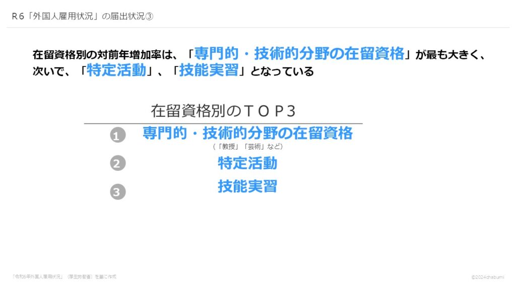 - 在留資格別増加率トップ3:専門的・技術的分野、特定活動、技能実習