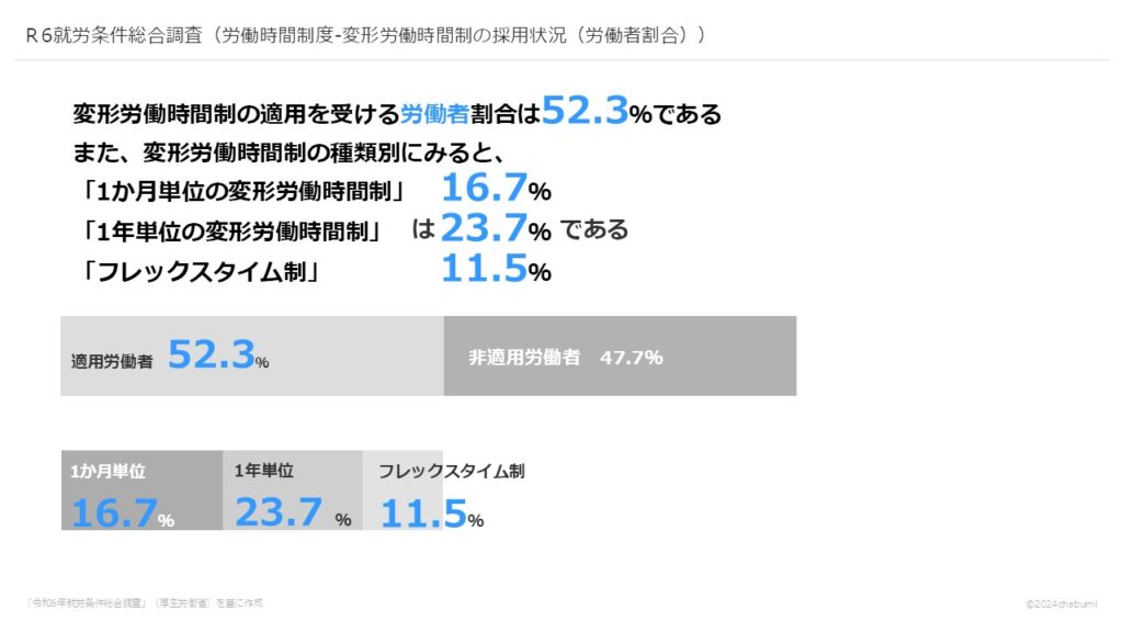 令和6年版の就労条件総合調査によると、変形労働時間制が適用されている労働者の割合は全体の約5割(正確には52.3%)となっています。