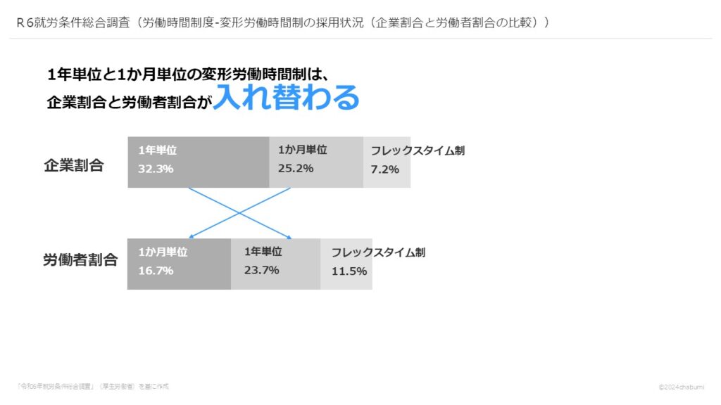 具体的には、労働者への適用割合では「1か月単位 → 1年単位 → フレックスタイム制」の順になっている点に注意です。