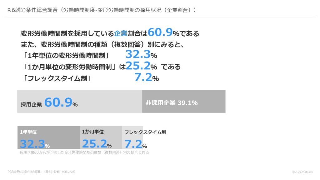 就労条件総合調査によると、企業の約6割(正確には60.9%)が何らかの形で変形労働時間制を採用しています。