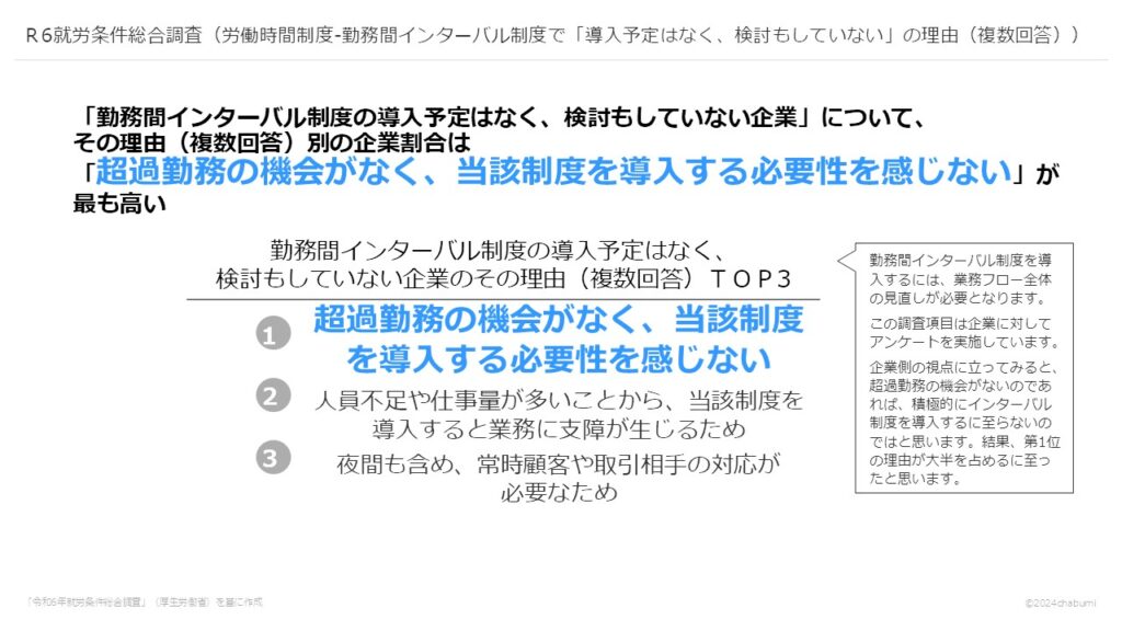 今回の調査は企業側へのアンケート形式で実施されており、導入していない理由として最も多かったのは「超過勤務の必要がないため」でした。 企業側の視点に立つと、そもそも長時間労働が発生していない場合、インターバル制度の導入を優先する動機が生まれにくいのも自然な流れかもしれません。