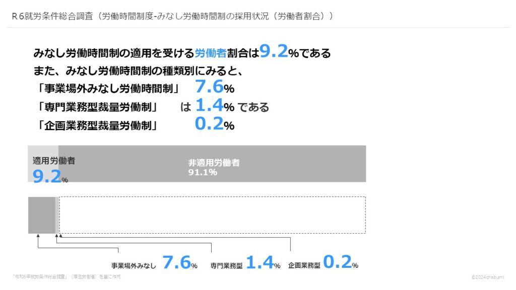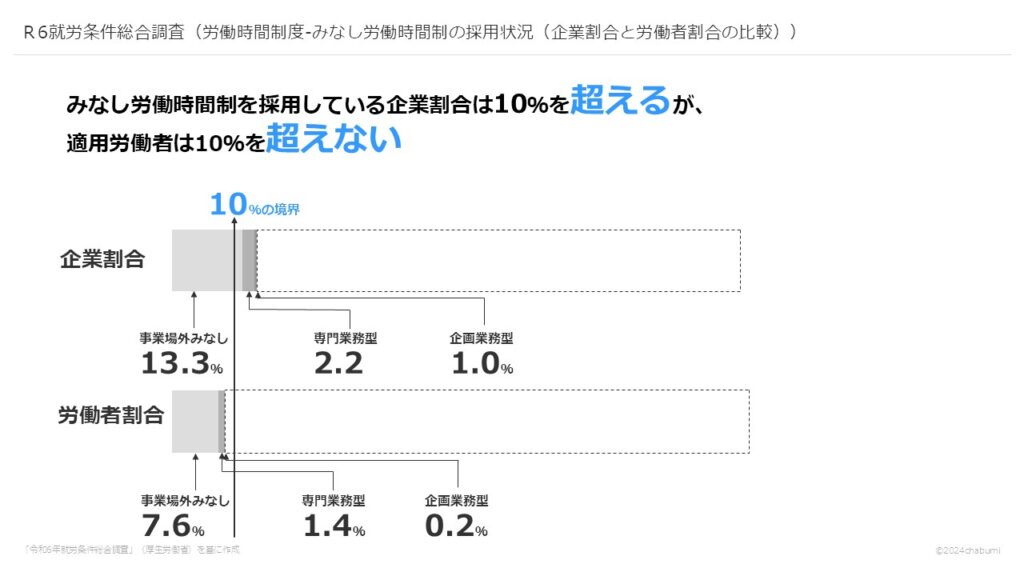 こうした背景から、令和6年版の調査では、みなし労働時間制を採用している企業の割合は15.3%、適用されている労働者の割合は9.2%と、いずれも比較的低い水準にとどまっています。